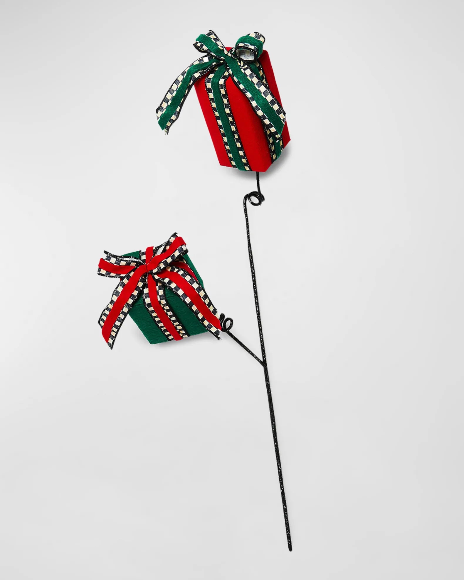 Accent arrangements, wreaths, and more with this gift pick, featuring green and red packages and tied with Courtly Check ribbon.