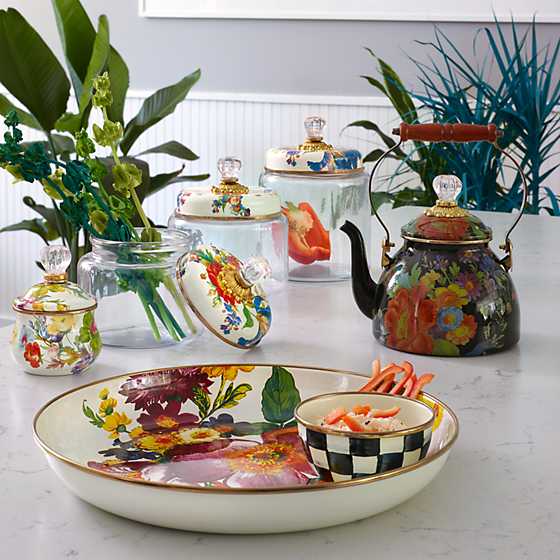 Bubbling over with MacKenzie-Childs style, our Black Flower Market 2 Quart Tea Kettle will have you finding new reasons to put the kettle on to boil. The heavy-gauge steel underbody is glazed with lush garden hues, hand decorated with fanciful botanical decals, and rimmed in bronzed stainless steel. Wood handle and glass-topped lid. Gorgeous filled with fresh-cut flowers or greens, too.