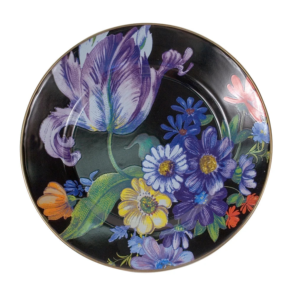 Set a sunny table in glorious color, fresh from a country garden, with Black Flower Market Dinner Plates. The garden-fresh design is color-glazed and hand decorated enamelware with floral transfers on both sides. Mix and match colors or pair with Courtly Check for a fun, fresh look, or for a bold arrangement, choose a single color for the entire table.