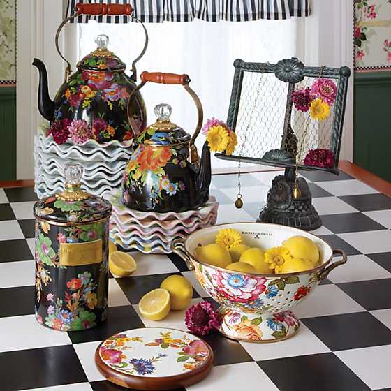 Give stainless steel’s impersonal style and plastic’s halfhearted work ethic the pink slip. There’s a new sous chef in town! For kitchen preparations with personality, look no further than the Flower Market Large White Colander. Fill with veggies grown in your own garden or hand-picked strawberries for a pleasing hostess gift. Color glazed in white, each colander is decorated with hand-applied fanciful botanical transfers that recall a lush English garden in the peak of summer.