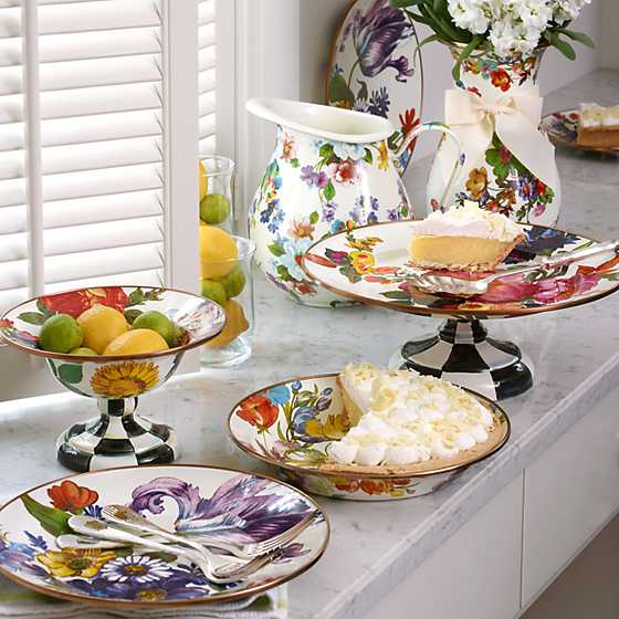 For ice water, fresh-squeezed lemonade or a refreshing punch, our bright and cheerful White Flower Market Pitcher dresses up the bar or dinner table. Makes a great gift paired with a basket of fresh fruit and a bottle of red wine for a stylish sangria, or fill with late-August sunflowers to add a cheerful warmth to your kitchen. Heavy-gauge, hand-glazed steel underbody with hand-applied fanciful botanical transfers that recall a lush English garden.