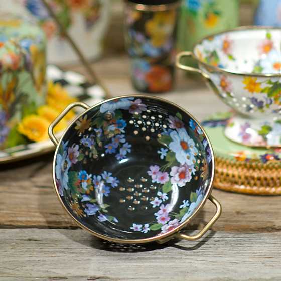 Give stainless steel’s impersonal style and plastic’s halfhearted work ethic the pink slip. There’s a new sous chef in town! For kitchen preparations with personality, look no further than the Flower Market Small Colander. Fill with veggies grown in your own garden or hand-picked strawberries for a pleasing hostess gift. Color glazed in black, green or white, each Flower Market Small Enamel Colander is decorated with hand-applied fanciful botanical transfers that recall a lush English garden in the peak of summer.
