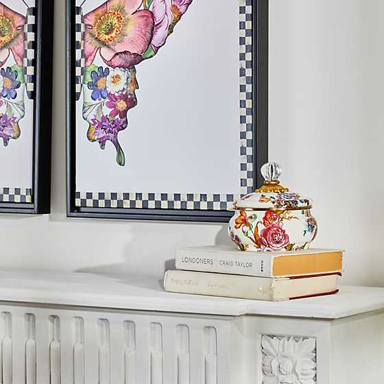 MacKenzie-Childs Flower Market White Squashed Pot heavy-gauge steel underbody is colour-glazed, hand decorated with floral transfers, rimmed in bronzed stainless steel, and topped off with an elegant glass knob.