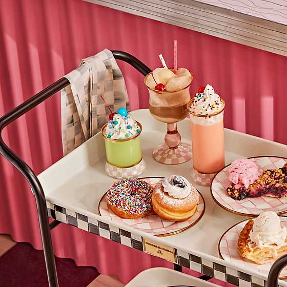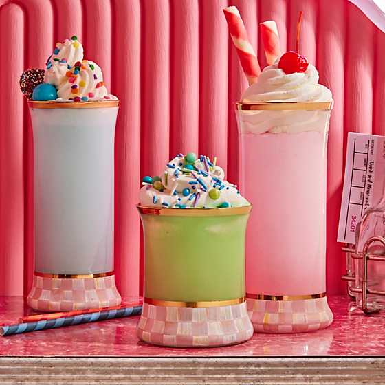 Make any occasion more special by setting the table with our set of two hand-painted Rosy Check Tumbler Glasses. These mouth-blown glasses, featuring a base of Rosy Check, are trimmed with gold lustre.