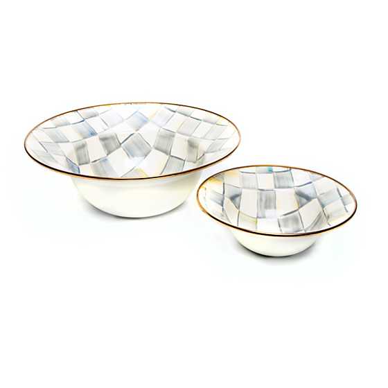 Our Sterling Check Enamel Serving Bowl is a generously sized durable bowl that’s a must-have in the kitchen. It’s decorated in our classic hand-painted Sterling Check, which features color-dragged checks in subtle shades of grey over a steel underbody.
