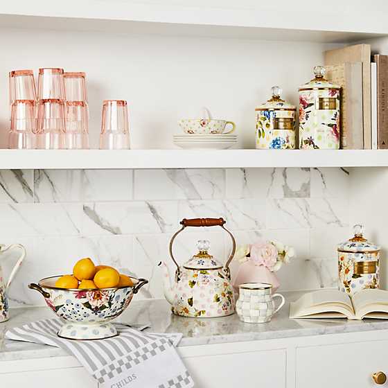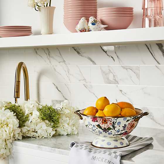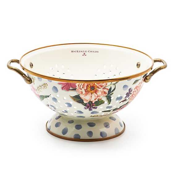 Give stainless steel’s impersonal style and plastic’s halfhearted work ethic the pink slip. There’s a new sous chef in town! For kitchen preparations with personality, look no further than the Blue Wildflowers Enamel Large Colander. Fill with veggies grown in your own garden or hand-picked strawberries for a pleasing host gift. Color glazed in white, each colander is decorated with hand-applied floral transfers on hand-painted blue splots.